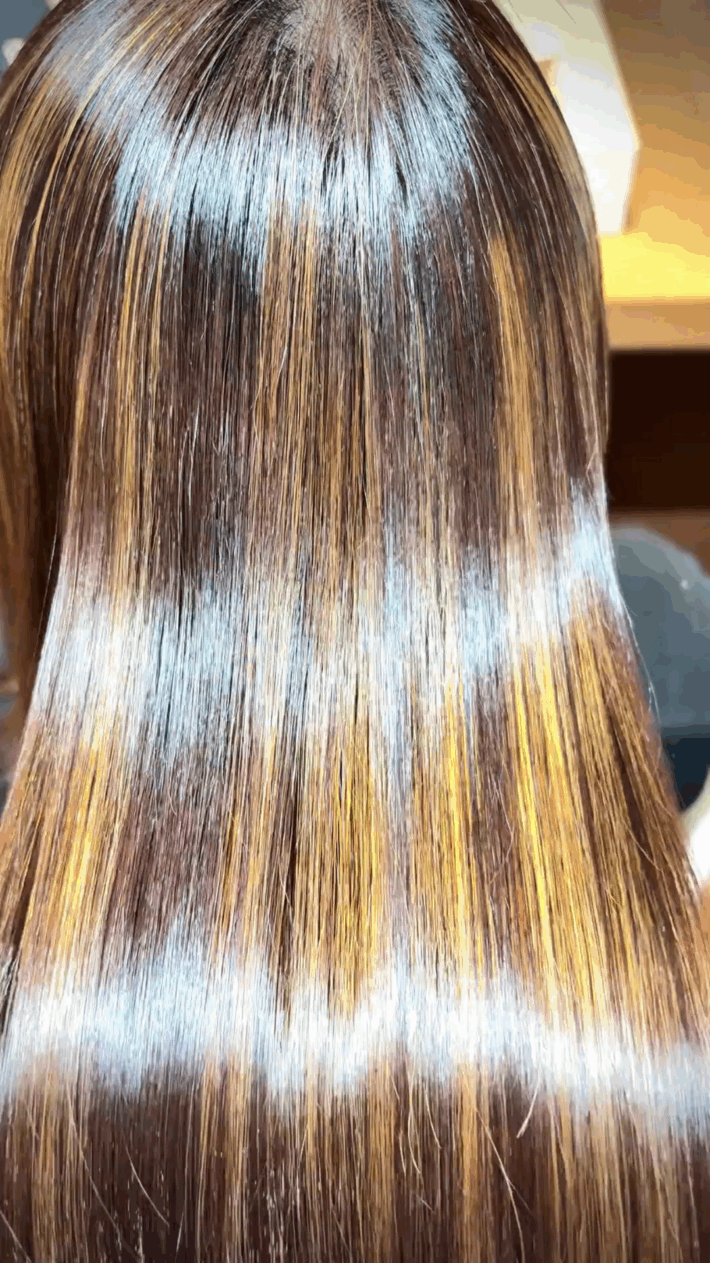 その一例となるのですが、ハイトーンのハイライトの方にも綺麗に縮毛矯正がかけられるような薬剤を新しく開発しました。